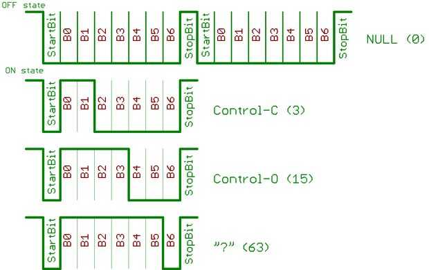 (Ahora que he dibujado imágenes, observará que los patrones de bits real no ideal. Desde rs232 serial transmite LSB primero, queremos cambio en ceros en lugar de los. Un ejercicio para el estudiante.)