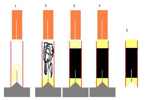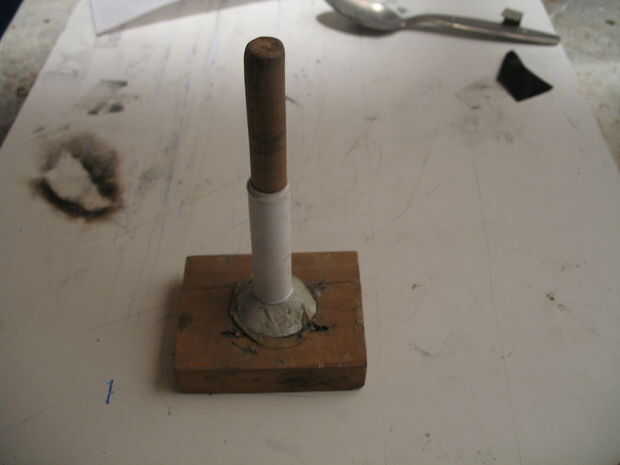 Primero coloque el tubo en el husillo y añadir a 1/2 con una cuchara de arcilla, este ESPOLÓN poniendo pasador en el tubo y golpea con el martillo.