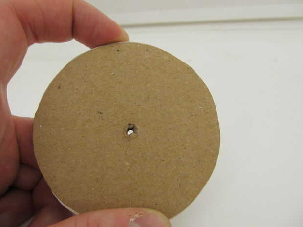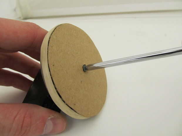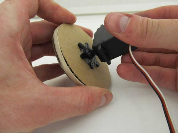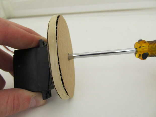 Ensanchar el agujero lo suficiente cartón para poner el tornillo en (pero no todavía). Presione el brazo del servo en el servo. Usted sabrá que es cómodo cuando se puede girar la rueda y oír los engranajes en el servo zumbido dentro. (No le des demasiado o se podría romper) Por último, atornillamos el brazo en el servo, y listo!