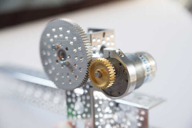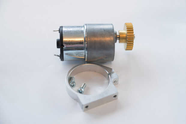 1) Coloque el piñón de 32 dientes 6 mm en el motor. Para este proyecto usé.5 muy lento RPM Motor para girar la lente extremadamente lenta. Experimentar con diversos motores RPM para encontrar la velocidad que usted necesita para su efecto deseado.