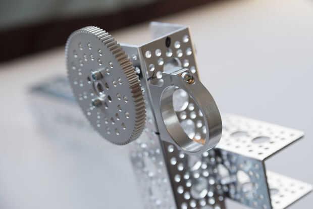 2) a continuación coloque el montaje del motor en el canal 9" al lado del gran engranaje de sujeción de aluminio. Introducir el motor y alinee los 32 más pequeños dientes de engranaje con el engranaje más grande de 84 dientes. Una vez que están engranando correctamente la abrazadera firmemente el motor.