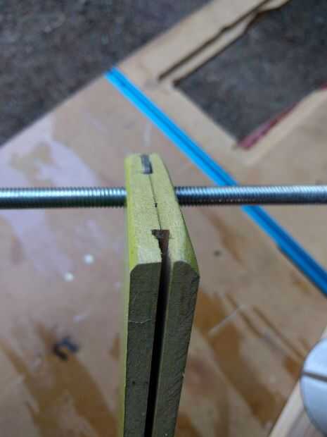 Corte un pedazo de trozo de placa de acero ~ 1/8" de espesor. Perfore un orificio de 5/6" de diámetro y rosca con un 3/8 x 16 grifo. Si no tienes una mano firme (o un ojo a plomo), puede utilizar el grifo en una prensa del taladro y gire el mandril con la llave manualmente hacia adelante y hacia atrás. Hacer un agujero más grande correspondiente en los dos tableros.