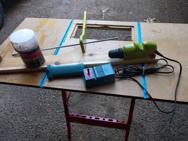 Cortar un tablero de madera o un producto similar del tamaño de un travesaño de la ventana. 3D-impresión de un soporte para sujetar la base del taladro a la Junta. Utilice un tornillo largo con unos espaciadores de plástico para sujetar el soporte para el taladro.