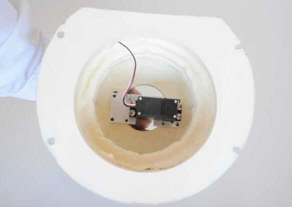 Centro de soporte del motor en el cuello del cuerpo. Nota hay cuatro tornillos que sobresalgan un poco del soporte que lo ayudará a Centre el soporte en el cuerpo. Para el robot cabeza apunte en la dirección correcta - 1. Asegúrese de que la muesca grande es hacia adelante como se muestra y 2. Asegúrese de que el soporte es paralelo con la superficie plana en la parte posterior del robot.