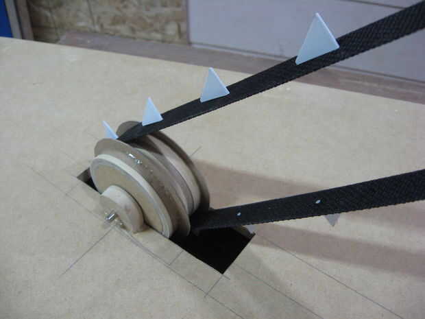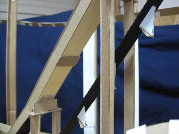 Una pista guía cartón fue construida alrededor de la cinta transportadora. Esta formada de pista de V mantiene las bolas centradas en el cinturón. Una pieza delgada de madera fue construida en la pista bajo el cinturón que mantiene la correa de la comba.