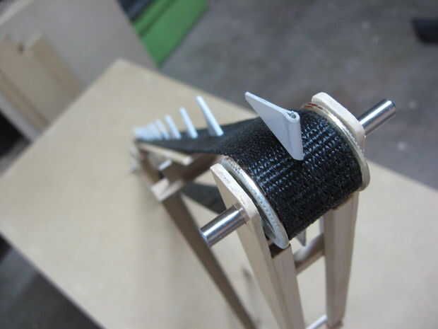 Se ha añadido poco triangulares pedazos de cartón al frente de cada clavo y "bandera" que mantienen las canicas en lugar de la pista mientras está siendo empujados a lo largo.