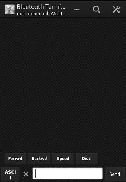 Utilizamos "Bluetooth Terminal" Android App de próximos prototipos. Los comandos fueron enviados a la Arduino usando una conexión Bluetooth. Para lo que es fácil controlar el regulador se definieron cuatro botones "Adelante", "Al revés", "Velocidad" y "Distancia". Funciones de estos botones son como siguientes: