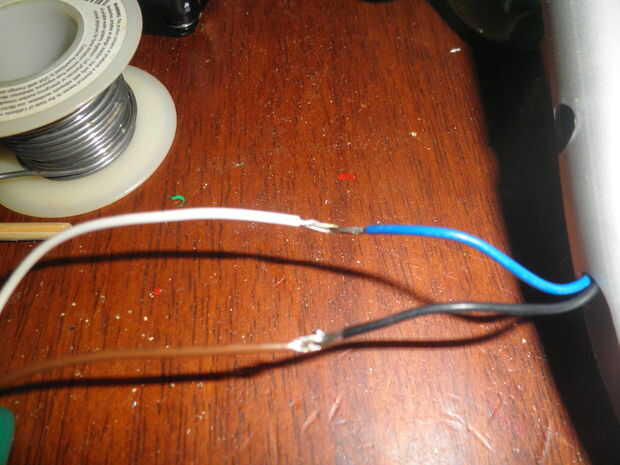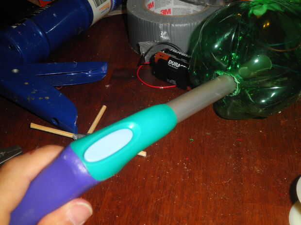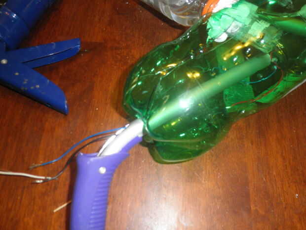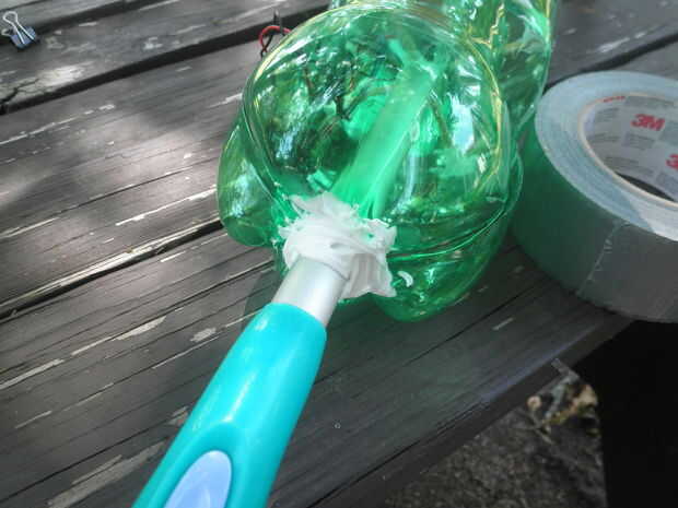 Una vez que los cables se sueldan puede asegurar el swiffer mango a la botella con la silicona. También aseguró el mango a los soportes dentro de la botella con más silicona.