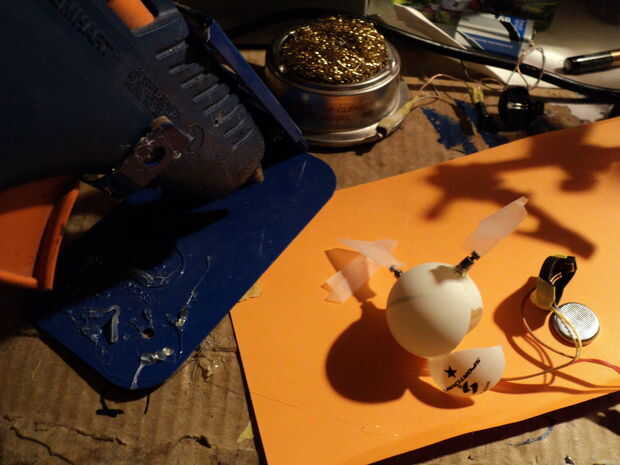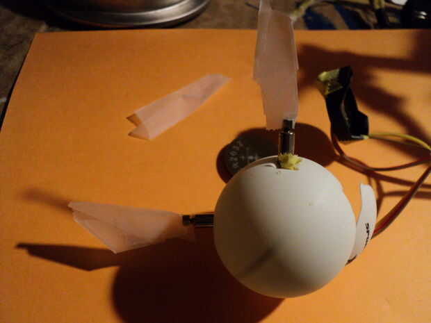 Había experimentado anteriormente con tratando de hacer las alas de algún alambre de joyas de oro muy fino y cinta pero era demasiado pesada para el motor a girar. También en un circuito de prueba, al tratar de soldar el cable con el peso sobre el eje, el calor podría haber dañado el motor o el peso adicional de la soldadura fue demasiado.