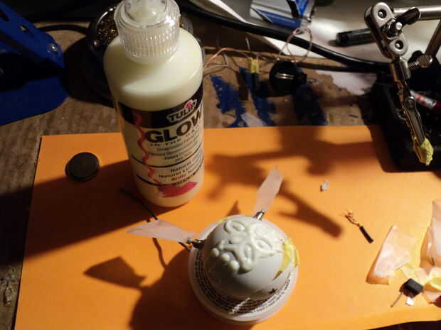 Hay un montón de la izquierda de la habitación en la bola para el LED. Busque cualquier "calculadora de LED" para calcular qué resistencia para usar para no quemar el LED.