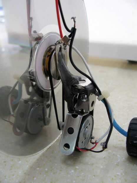 Foto 4 : motor de vista lateral. El motor es equivalente a uno de los motores pequeños en un reproductor de dvd. Yo tengo la mía de un juguete de ventilador solar sombrero. Yo sólo fabricado un montaje del motor que es mucho más complejo y feo que debe ser. Es realmente sólo tipo de pegado allí con un tornillo para sujetarlo firmemente. La correa de polea y coche motor vino también desde el reproductor de dvd. Usé una lavadora un poco más grande ajustaron al plástico de dvd para crear la polea del árbol más grande del cojinete. También es un simple encendido y apagado interruptor cableado allí para el motor. Tenga en cuenta que el motor nunca toca el suelo. Peso de Mutt está descansando en el dvd y una de las ruedas de soporte. Realmente se puede ejecutar con una de las ruedas de soporte que faltan.