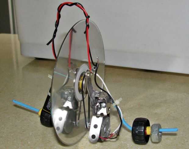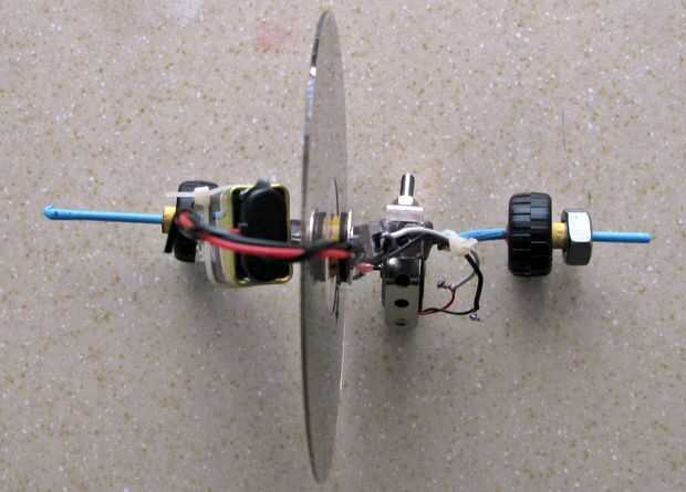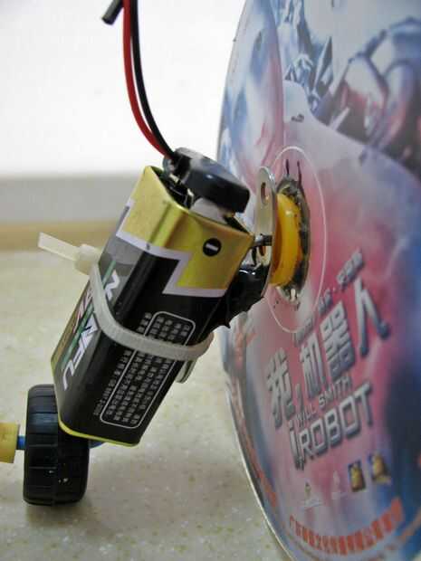 Foto 1 : vista lateral frontal. Básicamente esto es solo un dvd usado como la rueda principal y una percha que se utiliza como un árbol. Para un rodamiento inserté una rueda de plástico en el orificio central del DVD. Tiras metálicas que se ajustaron al árbol Perchero sirven como soporte de la batería y montaje del motor. Las tiras de metal también sirven para mantener la rueda principal centrada en el eje - una especie primitiva de anillo. La tuerca colgándose del árbol es sólo un simple contrapeso mantener Mutt va recto; el lado de la batería está un poco más pesada.