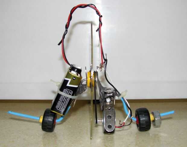 Todo : me gustaría construir un Mutt más grande con un motor más de gran alcance y utilizar un radio de dos canales para controlar el motor y un mecanismo de tipo de dirección. Desde que se inclinan es la rueda principal para encender la manera solamente razonable, he pensado sobre el uso de un motor o un servo para extender/retraer un contrapeso en un lado para hacer que gire el Mutt.