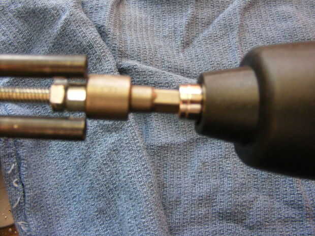 4. Ponga un sacatuercas de 5/16 en su destornillador eléctrico o perforar y montar la tuerca de acoplamiento - ahora podrás las mordazas abiertas y cerradas de la energía.