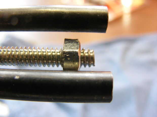 3. hilo de rosca de la tuerca de atasco de cerca de 1/4 pulgada sobre el extremo de la mordaza del tornillo (ver foto). Instale la sección de tuerca de acoplamiento más larga y apriete ambos juntos usando alicates de punta y una llave para cerradura firmemente la tuerca de acoplamiento al tornillo mordaza. Seguro extra - use Loctite en las tuercas.