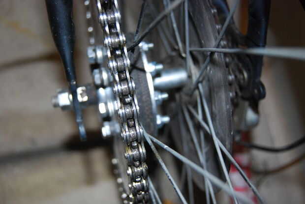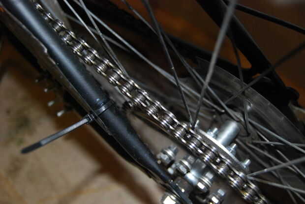 4. rueda dentada cadena de la rueda debe quedar alineada dentro de 1/2 cm para el piñón de cadena en el motor. La cadena de transmisión puede reducirse fácilmente a la longitud correcta. Se necesitan herramientas especiales para retirar y colocar el enlace principal al acortamiento de la cadena mediante la eliminación de enlaces. Idealmente, la cadena de impulsión del pedal y su cadena de transmisión del motor deben tener la misma tensión.