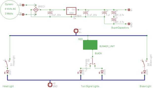 Con la incorporación de diodos 1N4001 x 2 en una configuración de "Y", las luces ahora funcionan por las baterías mientras que no se mueve (también conocido como "soporte de luces")