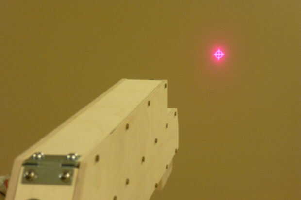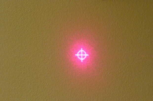 Un láser rojo con un patrón de punto de mira está montado en la parte delantera de la pistola bajo el cañón.