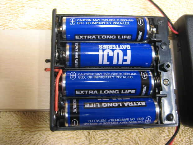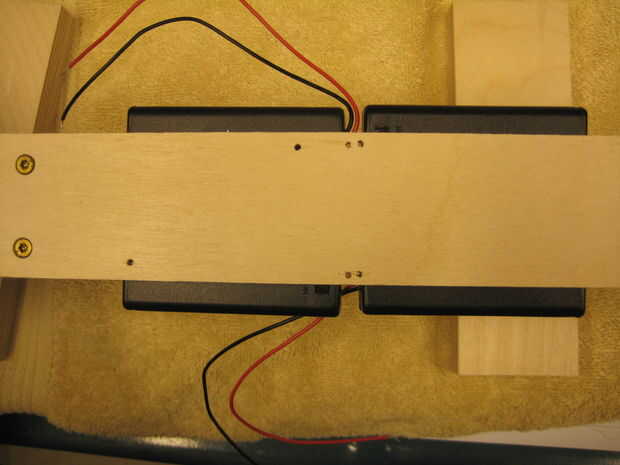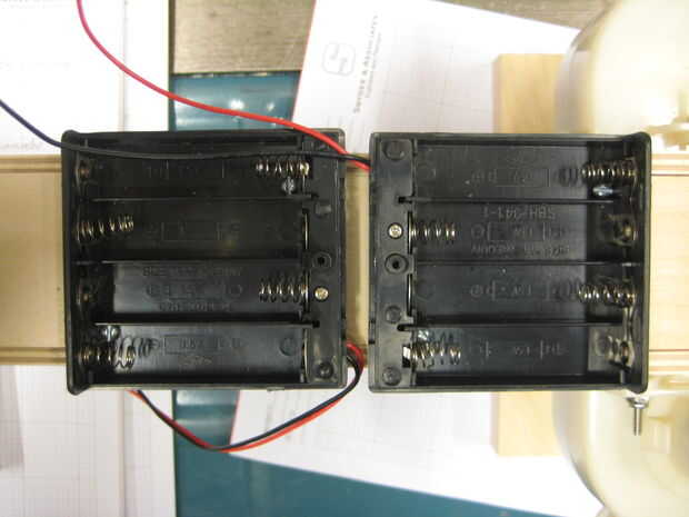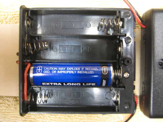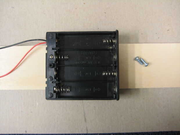 Usé algunos pequeños tornillos para madera para sujetar la caja de la batería a la parte inferior de la pistola. Perforé algunos agujeros en el soporte de la batería entre las posiciones de batería por lo que las cabezas de los tornillos no interfirió con las pilas o los contactos. Utilicé dos tornillos #4 3/8 pulgadas de largo. Estos fueron apenas lo suficientemente cortos como para que los tornillos no sobresalen por la parte inferior de la pistola en la sección de cañón donde salen las pelotas de ping pong.