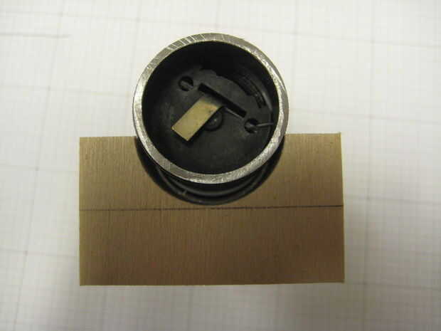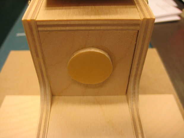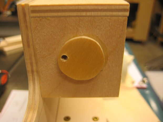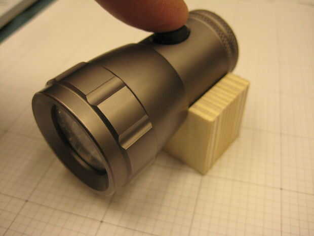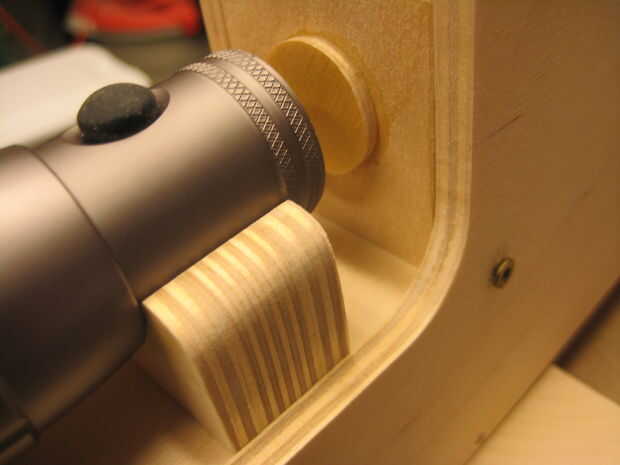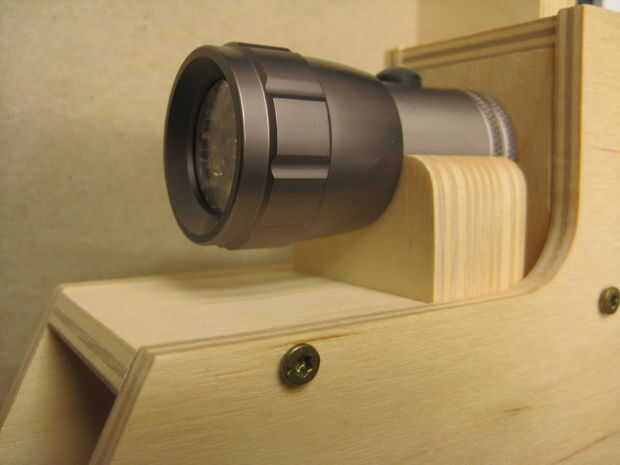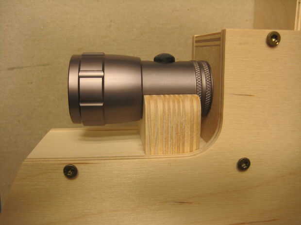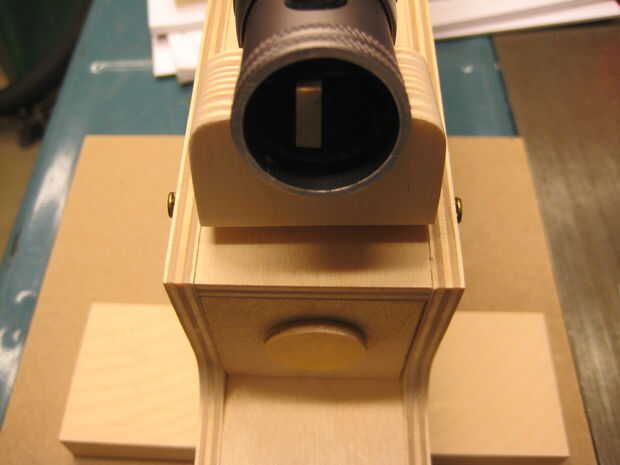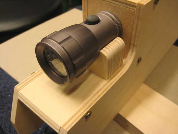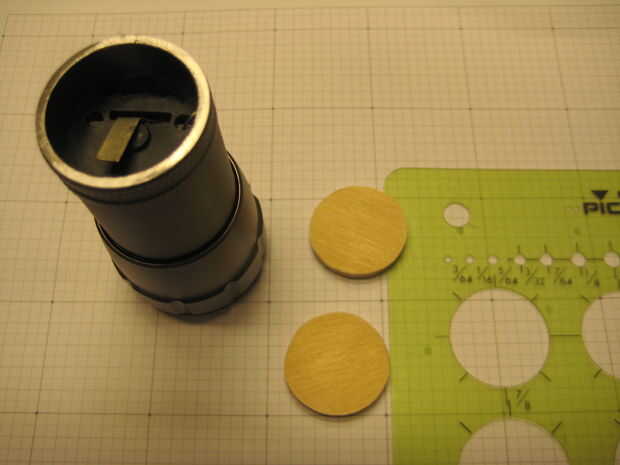 He añadido un disco grueso de 1/8 de pulgada de madera a la parte delantera del cuerpo de la pistola donde se conecta la linterna. El disco es un poco más pequeño que el interior diámetro del cuerpo de la linterna. Esto es el final de la linterna firmemente en su lugar una vez que está conectado a la base con pegamento caliente.