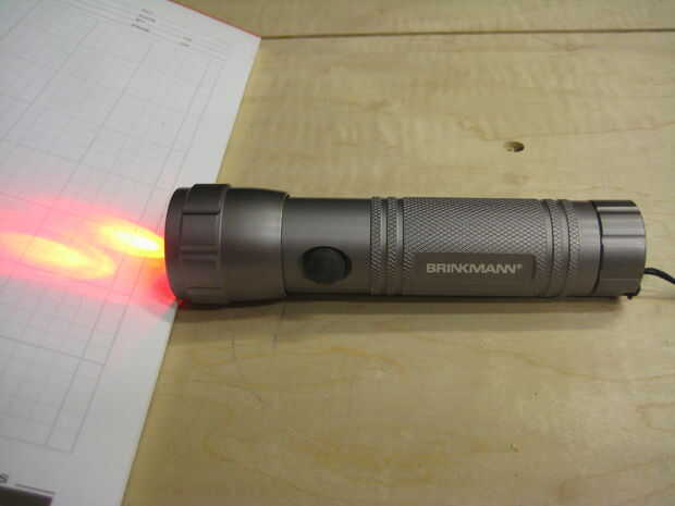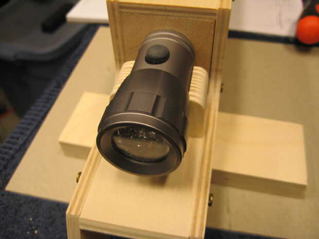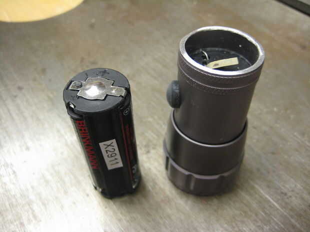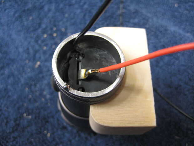 Había soldado los cables a los contactos de la linterna podría ejecutar del paquete de baterías AA que los motores. La linterna fue diseñada para 4,5 voltios de c.c., así que corrí cables separados a 3 baterías en uno de los paquetes de baterías a la cabeza de la linterna. Esto permite que la linterna que se ejecutará por separado de los otros artículos de alimentación de la batería misma.