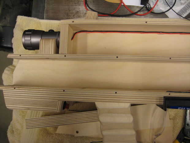 El titular de la base de la linterna se une a la parte superior del cañón con unos tornillos para madera #4 que son avellanados en la parte superior del cañón para mantener las cabezas de los tornillos alejados de las pelotas de ping pong se dispararon. Perforé un asimiento pequeño por el disco de madera en el que los dos cables para la energía de la alimentación. Estos cableados tuvo que pasarse a la parte posterior de la pistola y luego a la batería delantera.