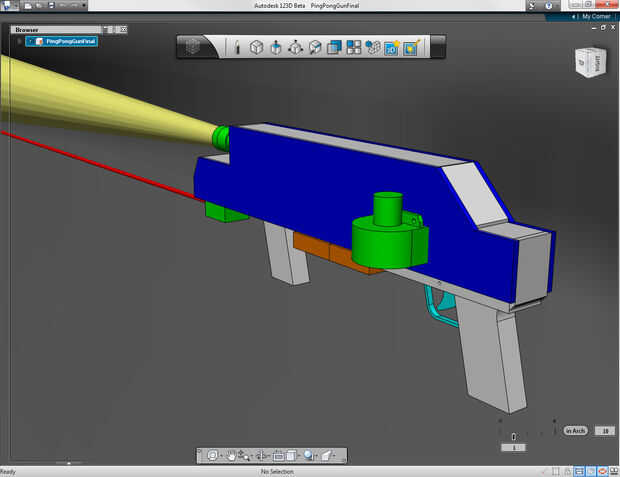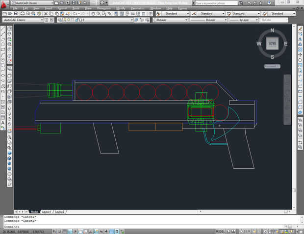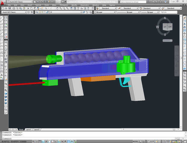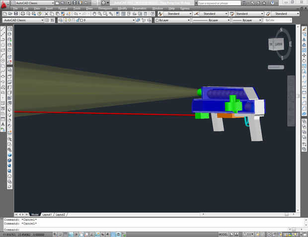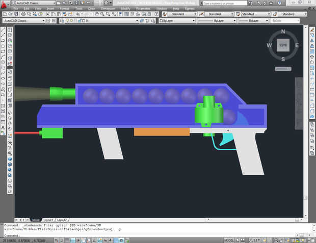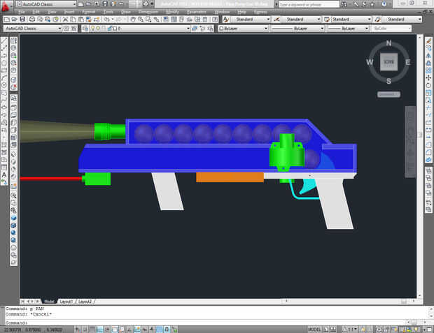 Diseño de las armas en Autocad como elementos 3D y luego importen el modelo 123D. He estado usando productos de autodesk durante mucho tiempo así que esto era la forma más rápida para crear el modelo 3D. Los tipos de archivo diferentes se unen para su uso. Me agregar materiales a los objetos en el 123D y pensé que la prestación parecía realmente bueno. Los colores de las diferentes partes de la pistola se utilizan para mantener los diferentes elementos separados y más fáciles de ver.