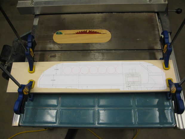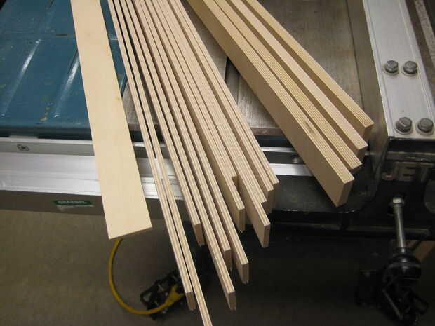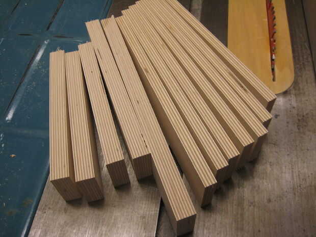 Corté la mayoría de las piezas de las armas hacia fuera usando una sierra de mesa y sierras de cinta. Lija en los bordes de las piezas mediante un eje oscilante y lijadora de banda. No conseguir demasiado colgado para arriba en conseguir todas las piezas de corte exacto ni tener bordes cuadrados. Creo que es mejor tener los bordes lijados un poco para una sensación más suave de todas formas.