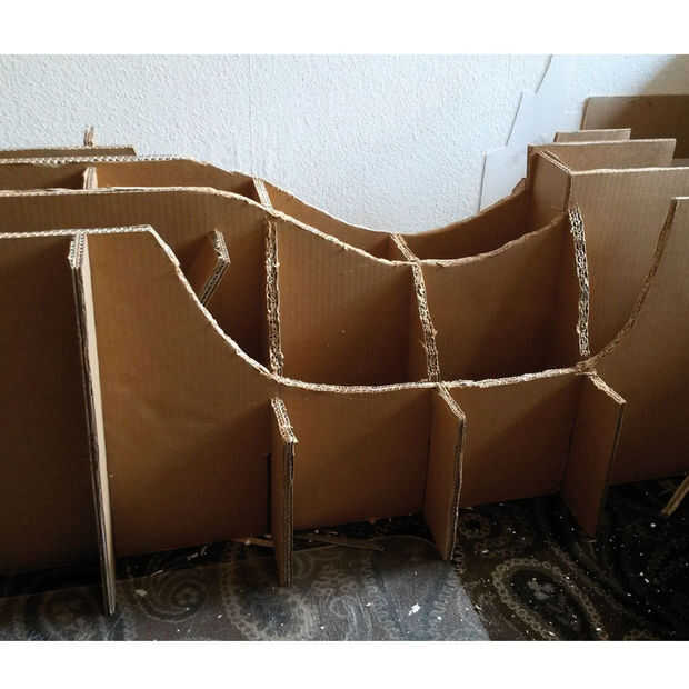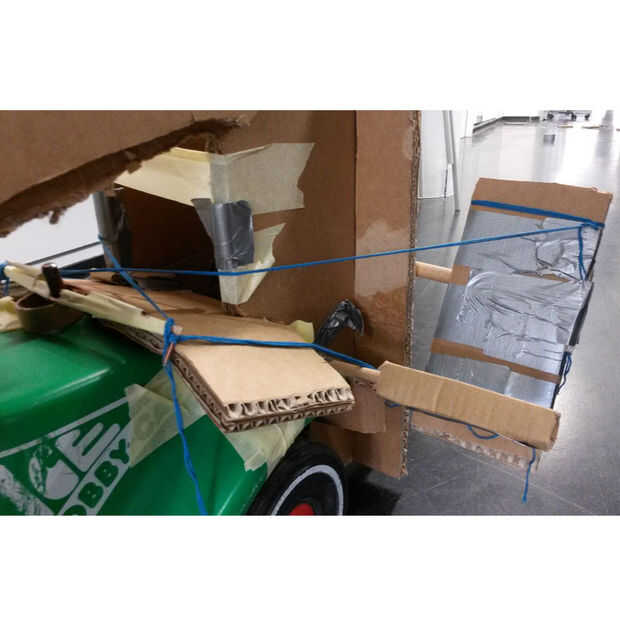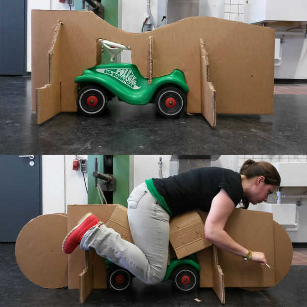 Para encontrar la forma de la tierra de nuestra construcción básica y aún la forma la proporción ergonómico, construimos una estructura cruzada de papel corrugado fuerte. Partir de aquí podríamos encontrar la forma perfecta a nuestro cuerpo. Lo cortado hacia fuera y de todas las partes que no necesitamos para caber en el carro de Bobby y encontrar las mejores posiciones para los pies y las manos. (Necesita saber, teníamos un montón de premodells...) La idea de las funciones de dirección apareció después de mucho de otros modelos técnicos, así que finalmente este una que ves está trabajando y puede conectarse entre pies y el volante de los coches de Bobby. La función de la rueda delantera como una manivela no era necesario "premodel", estaba trabajando directamente por tratando en su tamaño original... Puh!