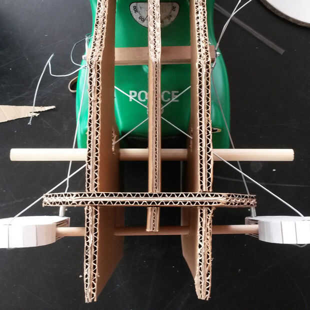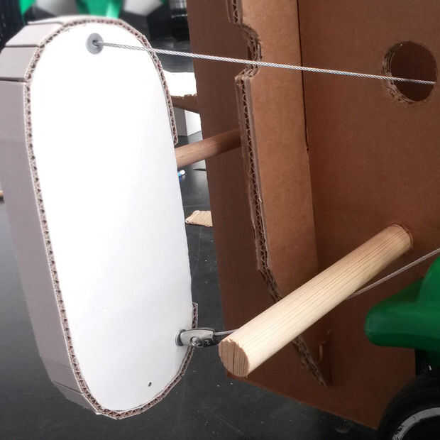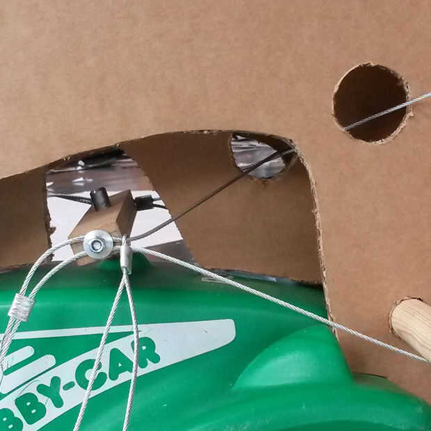 La tecnología y mucho más difícil, de dirección, debe ser lo bastante fuerte como para no dar durante el uso de los pies! Así que quitamos el volante de la Bobby Car aumentar el ángulo para conseguir un mejor resultado de torneado. Para solucionarlo utilizamos cables de acero. Los pedales son de muchas layes de papel corrugado pero necesita para asegurarse que el orificio del eje es todavía lo suficientemente grande como para moverlos fácilmente. Los dos fijan puntos en el pedal y el cable de acero de un lado cruzado trae el mejor equilibrio en movimiento, también se podría simplemente utilizar un pie para dirigir. Así que allí están siempre en movimiento paralelo en direcciones opuestas.