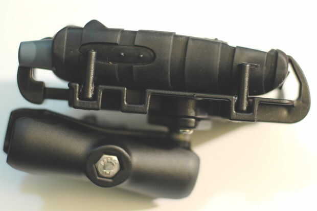 Resultó que mi PDA era un poco demasiado gruesa para el soporte agarrar correctamente, sobre todo con una piel protectora caso de (que es probablemente por qué RAM recomienda el otro). Las pinzas con resorte a cabo bastante bien, pero pude conseguirlos para deslizarse tirando la PDA bastante duro.