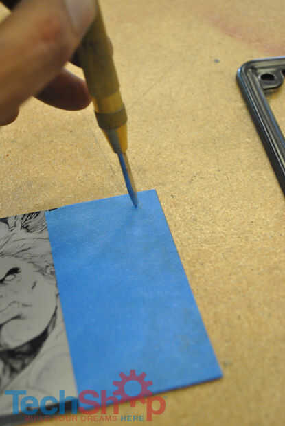 Una vez cortadas en el esquileo, una vez más poner el marco en la placa solo para ver si se ajusta perfectamente. Una vez que haya terminado con eso, poner alguna cinta de pintor en la parte delantera de la placa. Lo hice por dos razones, para protegerla de arañazos al azar y tienen una superficie para marcar mi agujeros.