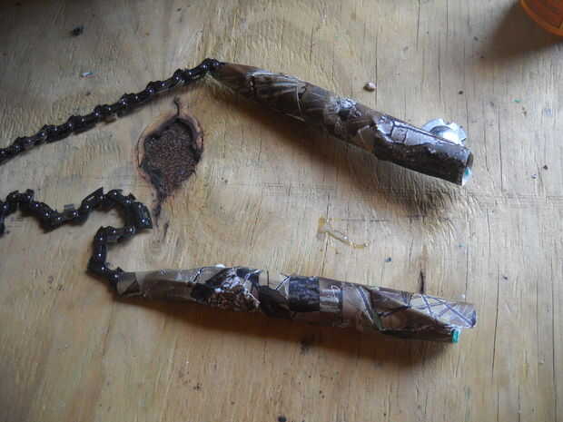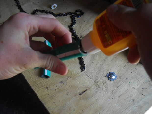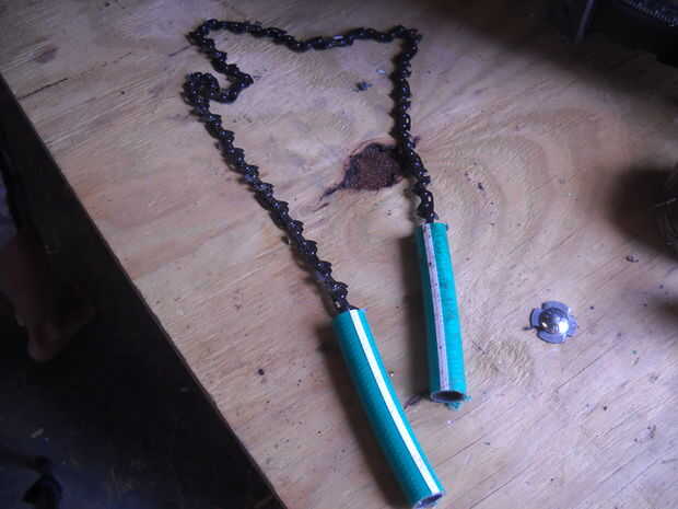 Sumergir las asas de la manguera en un recipiente con agua y sacudir el exceso de agua. Pegamento del gorila establece en superficies húmedas, razón por la cual se humedezca el tubo. Poner pegamento gorila de la cadena y algunos en la manguera, luego deslice la manguera sobre la cadena. Ponga cinta para conductos Sujete la manguera a la cadena y cubre las asas para mangos mira más agradables. Fui con cinta camo... le da un sabor agradable varonil. Después de que el pegamento seca ir a probarlo, luego cosas en el bolsillo para el próximo viaje de camping. ¡ Disfrute!