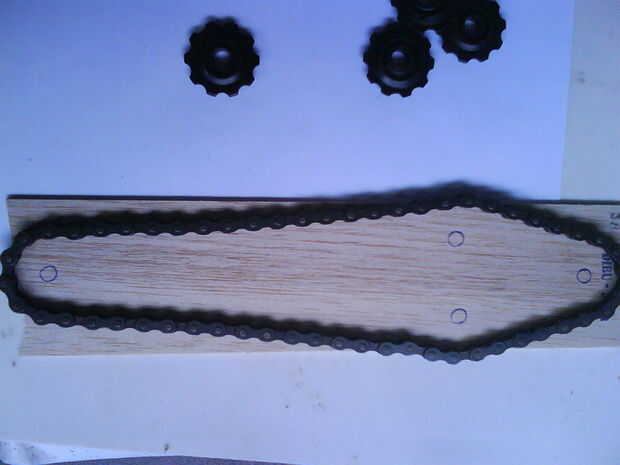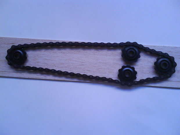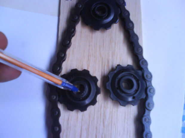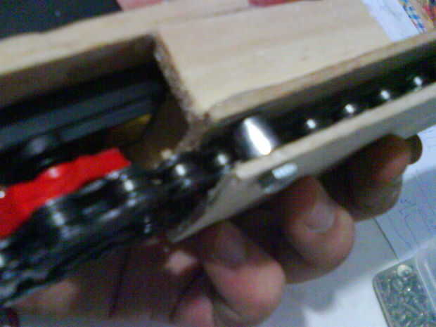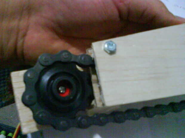 Hice un servidor para poner la cantidad y había pegado en el cuerpo de la montaña por el mismo método de ensayo y error. Se encontró que la cadena era todavía un poco floja. Por lo tanto, utilicé dos tornillos para el cilindro de metal para estirar un poco la cadena. el resultado fue muy bueno.