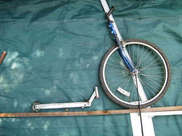 Realidad de diseño asistido por se refiere a la colocación de las piezas hacia fuera y echando un vistazo a la geometría.   (no es necesario software)  Aquí estoy configurando las bases de un cuerpo de scooter detrás de un extremo delantero de la bicicleta de montaña.  El criterio representa el eje de dirección (centro del tubo en la cabeza).  Tenga en cuenta que el eje de manejo interseca la tierra delante del punto de contacto del neumático delantero en la carretera.  El punto de contacto del neumático ' senderos "el eje de dirección.  Como Nota para los diseñadores de moto... La curva de las láminas de la bifurcación se produce "rastrillo" aka "offset" que consume parte de la ruta para acortar o apretado-para arriba el camino para un cierto ángulo y la rueda diámetro de la cabeza.