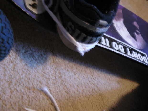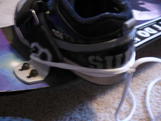OK, así que ahora, las puntas de los cordones de los zapatos del lazo sobre los lados de la Unión y atar en la espalda, apenas tan apretados como quieras para montar a caballo. Nudo 2 - 4 veces, para la fuerza agregada (bueno que esto es para sostener). Luego cortar el cordón extra detrás del nudo.