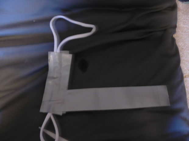 Ahora deshacer su correa de fijación y sacar el nuevo heelstrap. debería verse como la imagen de abajo. entonces reforzar la correa enrollando una tira de otro o dos de cinta adhesiva alrededor de la correa. (la foto muestra cómo se ve antes de enrollar)