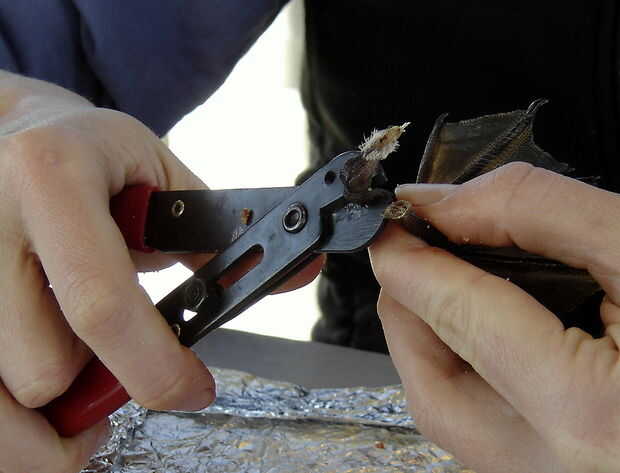 De cualquier manera, es como cortar un hueso de pollo seco de igual tamaño. Un cuchillo o tijeras normales probablemente no hará un buen corte, por lo que realmente necesita las tijeras para cortar a través el hueso de la pierna sin romperlo.