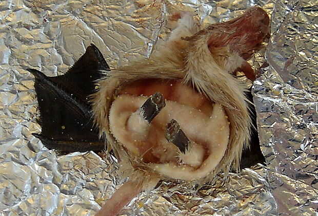 Empuje la pierna de pato la pata "manga" y en el cuerpo del ratón. Que se trata de un ajuste muy apretado, y la piel estira un poco para acomodar la pierna. Si no hay espacio suficiente puede que necesite ajuste más hasta llegar a una parte más ancha de la pierna. Repita con la otra pierna.