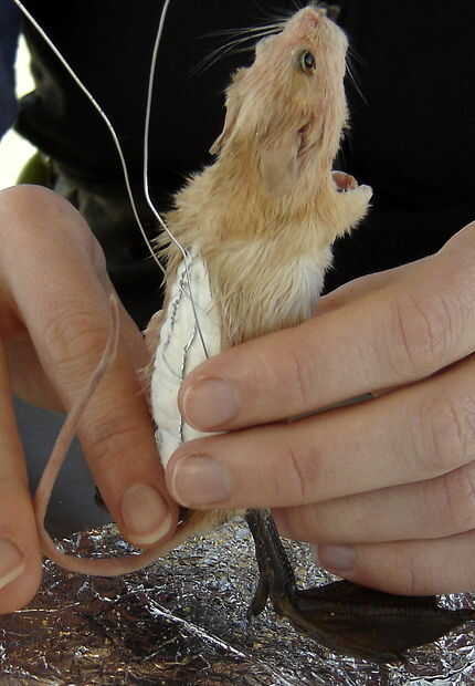 Usted querrá el ratón para bien de pie sobre un trípode: las dos patas y su cola de pato. Manipular el cable según sea necesario, obtener su pato las piernas en la posición correcta y vuelva a ajustar el alambre según sea necesario. Meter los extremos de alambre trenzado bajo los cables de la pata delantera y asegúrese de que los extremos puntiagudos se clavan en el muñeco vudú de algodón para evitar accidentales traspasarlas o daño a la piel.