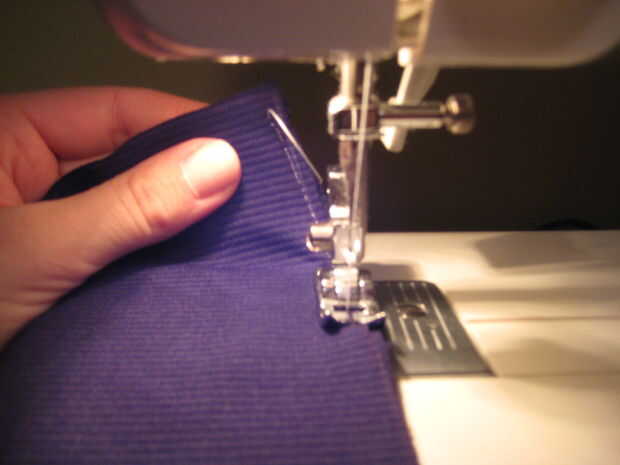 También, asegúrese de dejar aproximadamente una pulgada de material detrás del pie de la máquina para que el material no se quede atorado debajo del pie y puede empujar el material a través durante la costura.