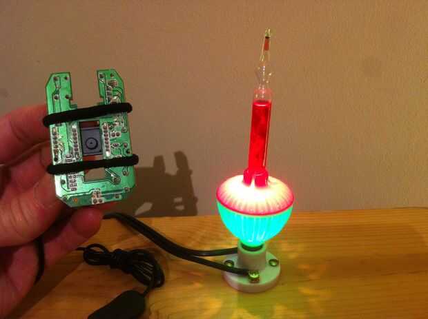 Usar una banda elástica negra para sostener el sensor del ratón a la luz de la burbuja. El sensor del ratón tiene una abertura de agujero de alfiler pequeño. Este agujero de alfiler se coloca contra el vidrio de la luz de la burbuja. El movimiento de las burbujas se interpreta como movimiento por el ratón. Si conectar el ratón a un ordenador verá el cursor en la pantalla mover alrededor aleatoriamente.