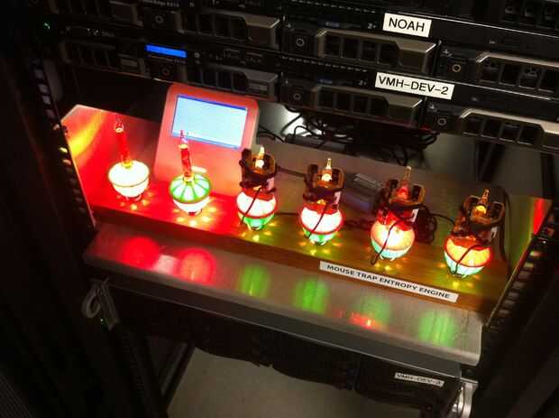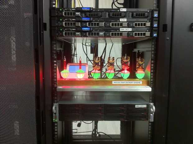 Esto muestra el ratón trampa entropía motor instalado en un rack de postes cuatro estándar de 19".