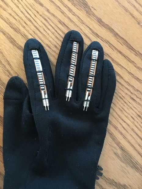 Los sensores fueron sembrados en el guante y pegados en la punta por lo que no podría deslizarse hacia fuera, hasta ahora este método ha sido muy acertado, aunque si va a los sensores a los cables de la soldadura, usted querrá seguir adelante y hacer antes de pegarlos en. También he añadido algún pegamento extra a las cabeceras, por lo que yo no tendría ningún problema en el futuro con un cable cruzado.