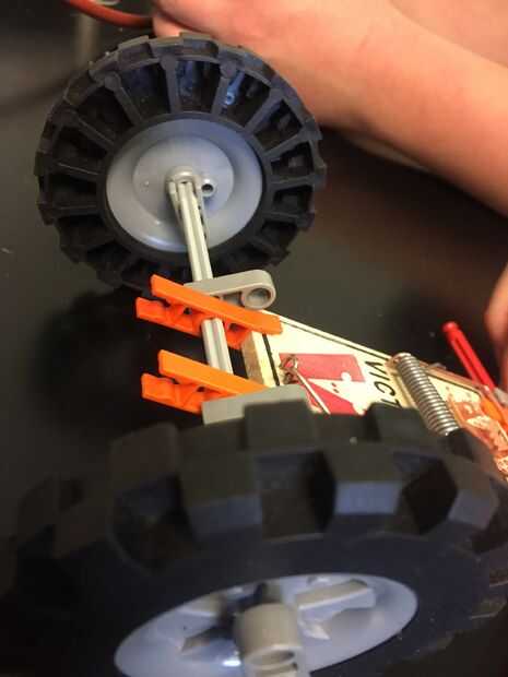 Acople 2 gris, precios más pequeños a ambos lados de la trampa para ratones en ejes para prevenir el movimiento. Deslice y pegamento caliente detrás neumáticos a axel. Repita para el eje delantero.