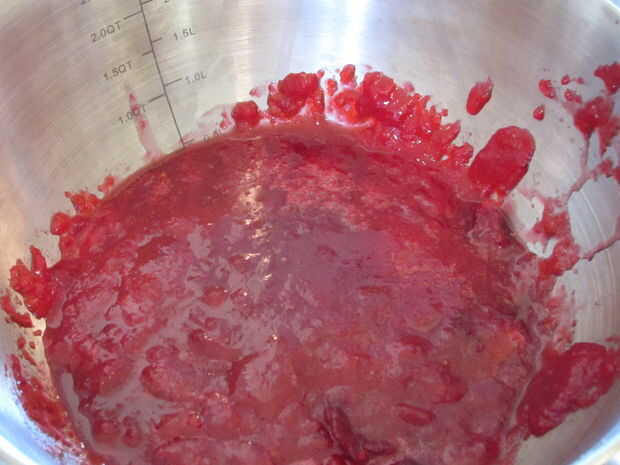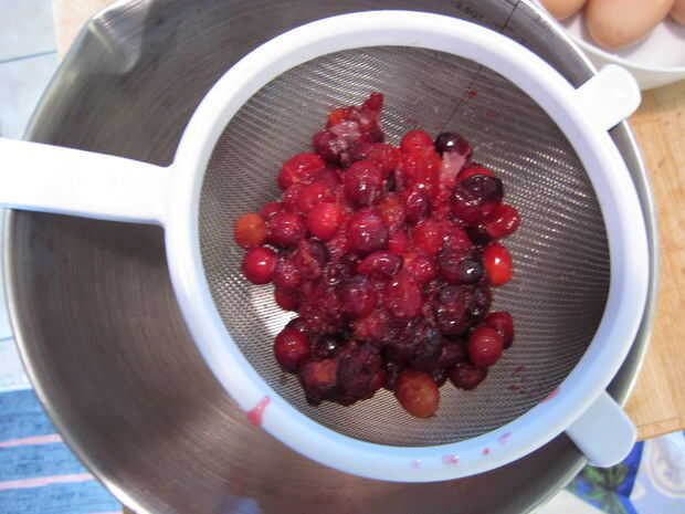 Mientras que los arándanos rojos son todavía calientes, escurrirlas para eliminar las pieles. Coloque el colador sobre un recipiente. Pequeñas porciones de una cuchara de arándanos en el colador. Con una cuchara de madera, revuelva y presione firmemente la mezcla contra la malla hasta que queden sólo las pieles de arándano. Esto tomará un poco de músculo, pero si no mush las bayas para todos valen, te pierdes mucho el sabor agrio. Desechar las pieles y continuar hasta que todos los arándanos están agotados.
