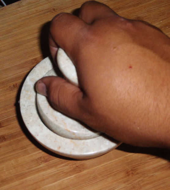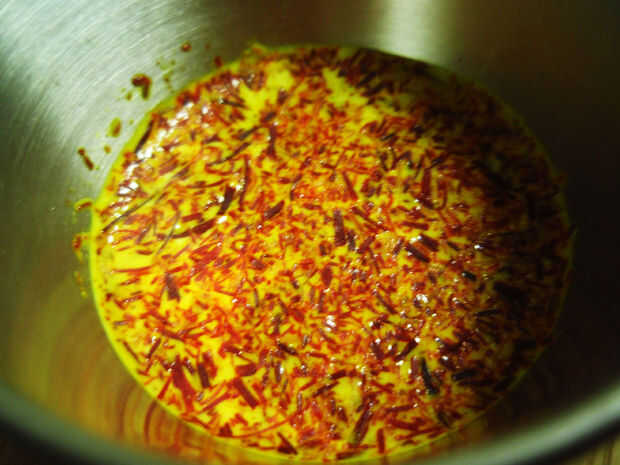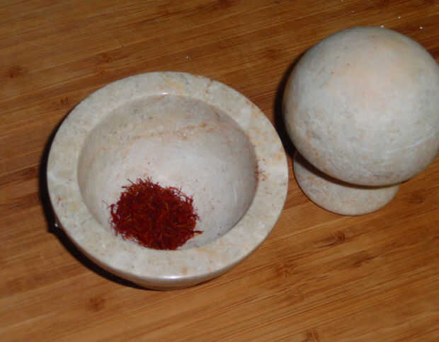 Rápidamente saque el azafrán de la cazuela y triturar en un mortero y una maja. Colocar en una taza pequeña. Microondas la leche durante 10 segundos y añadir el azafrán. Apartar la taza.