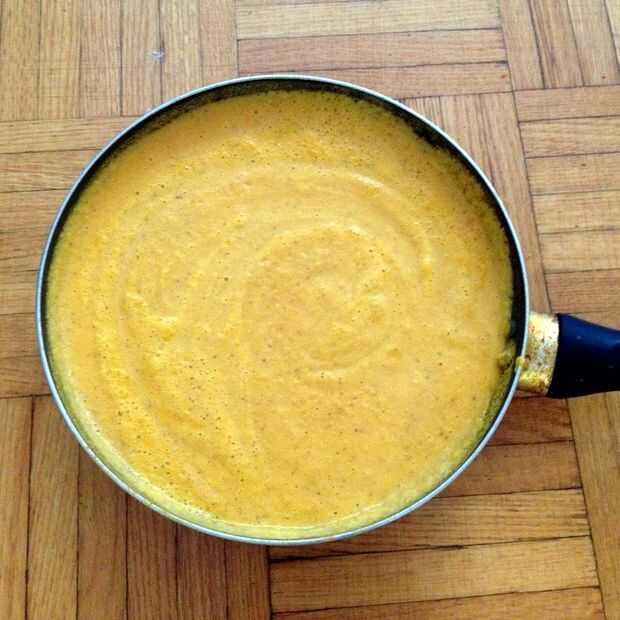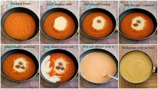 1. Tome el puré de calabaza en una cacerola grande. Combinar condensar la leche, nuez moscada, canela, cardamomo molido, azúcar moreno y mitad crema de leche de la tierra en el puré de calabaza.