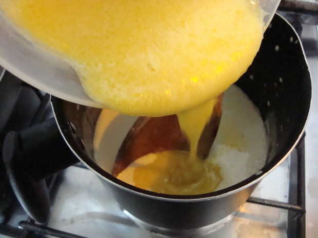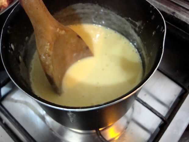 Vierta las yemas de huevo con crema lentamente sobre la infusión de leche/albahaca. Agitar bien y calentar otra vez hasta que la mezcla empiece a espesar un poco (hacer hervir, ni se cuaje). Esta es una crema básica.