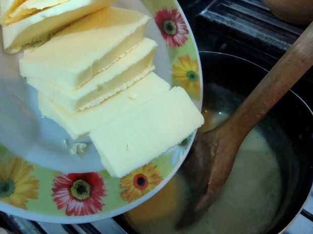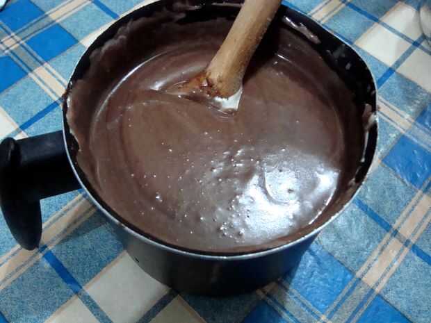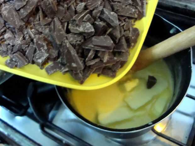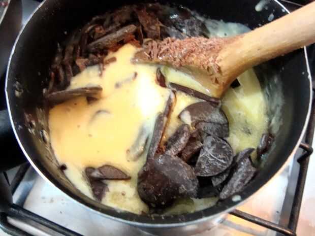 Retire la crema del fuego y añadir 220 g de trocitos de chocolate con leche y mantequilla 90 g sin sal en trozos pequeños. Mezcle bien y deje enfriar. Una vez que se enfría la mezcla, suavemente doblar en 250 ml de crema de leche batida a picos suaves Ponga a un lado.